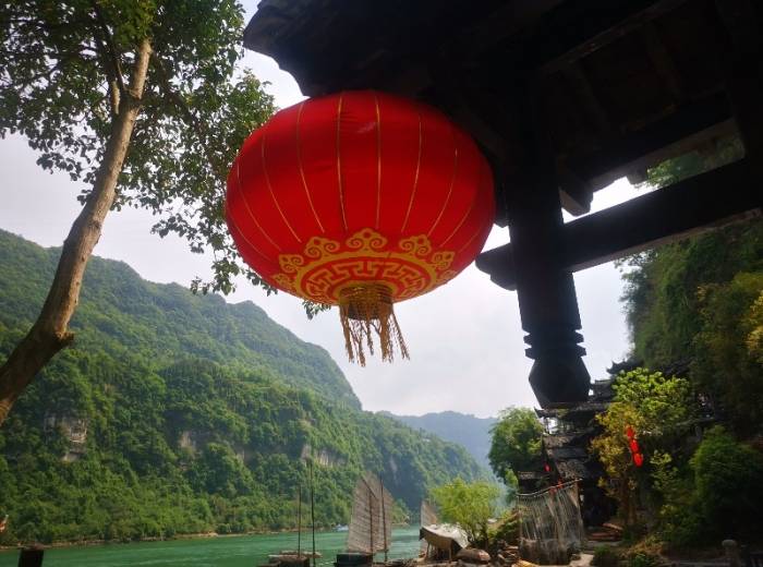 10:30换乘景区中转车到胡金滩码头,渡船过江后游览三峡人家(石令牌、巴王宫、茶盐古道非遗传承一条街,巴王赛,三棵树广场观看演出)