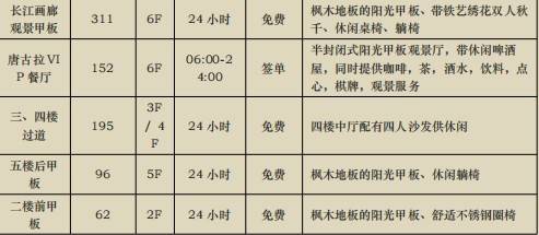 首创游船中部从2层直达6层的全镂空透明大堂,视野开阔,气势恢弘,自然的阳光倾泻而下,使客人一登游船,便有豪华舒适的心理感受;首创的双观光电梯从一楼直达五楼,与六楼阳光甲板相连。