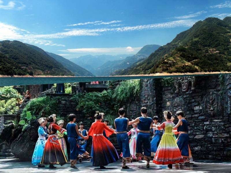 10:30- 12:00:换乘景区中转车前往胡金滩码头,渡船过江后游览山上人家(石令牌、巴王宫、茶盐古道非遗传承一条街、巴王寨,三棵树广场观看演出)