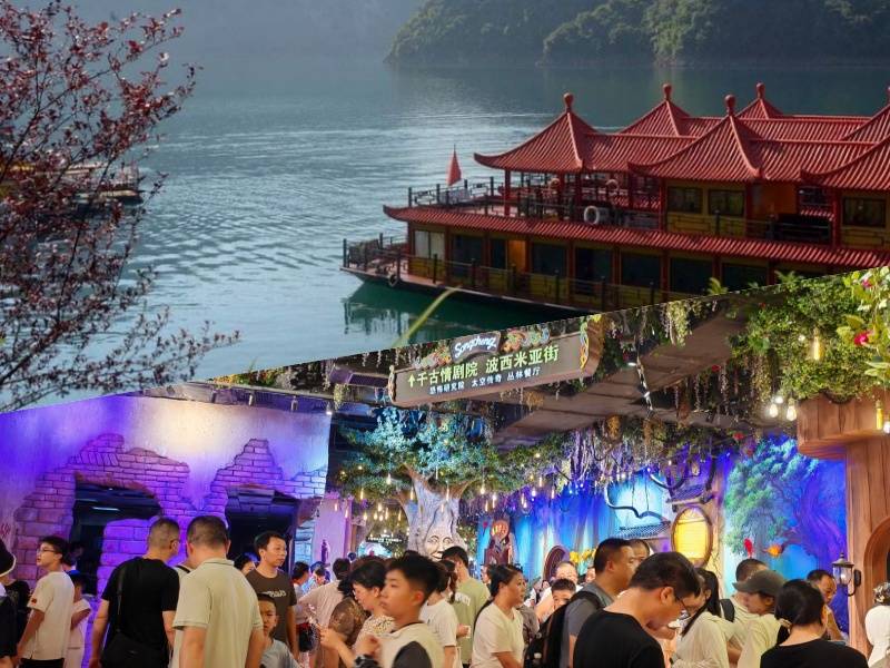 多媒体光影秀《三峡奇缘》、VR 体验项目《太虚幻境》(自费40元/人)、《长江万里图》电影馆、裸眼 3D《梦幻空间》《太空传奇》等互动项目上天入地、穿越古今。沉浸式体验项目《郑和下西洋》、聊斋惊魂鬼屋、恐怖研究院等,光怪陆离、惊心动魄。整个景区建有风雨连廊,不惧日晒雨淋,全天候轻松畅玩,老少同乐,晴雨皆宜。