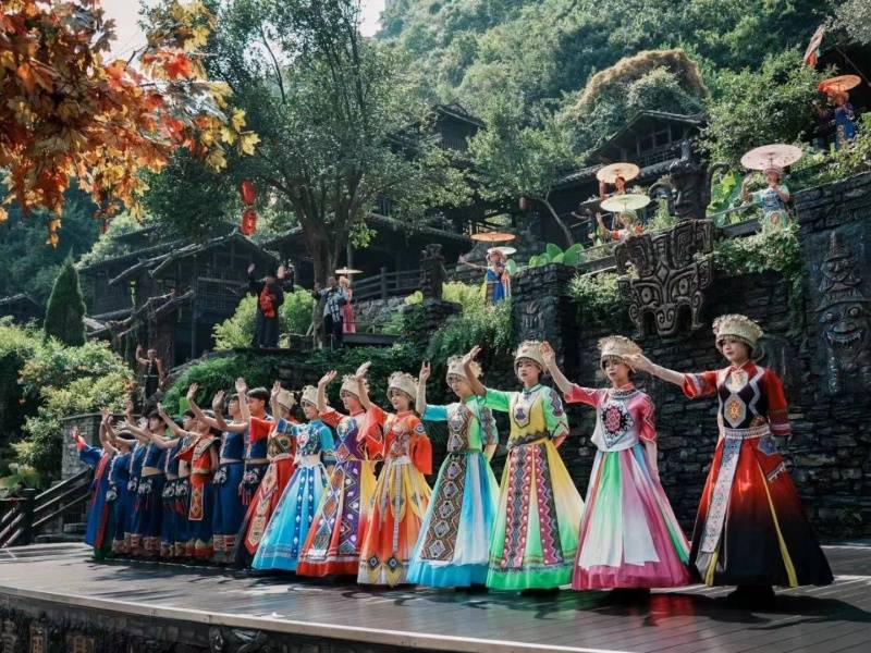 12:00- 15:00:景区自理午餐。下午游览龙津溪(龙溪桥、鹊桥、婚嫁楼表演、峡江号子、 迎宾表演)。