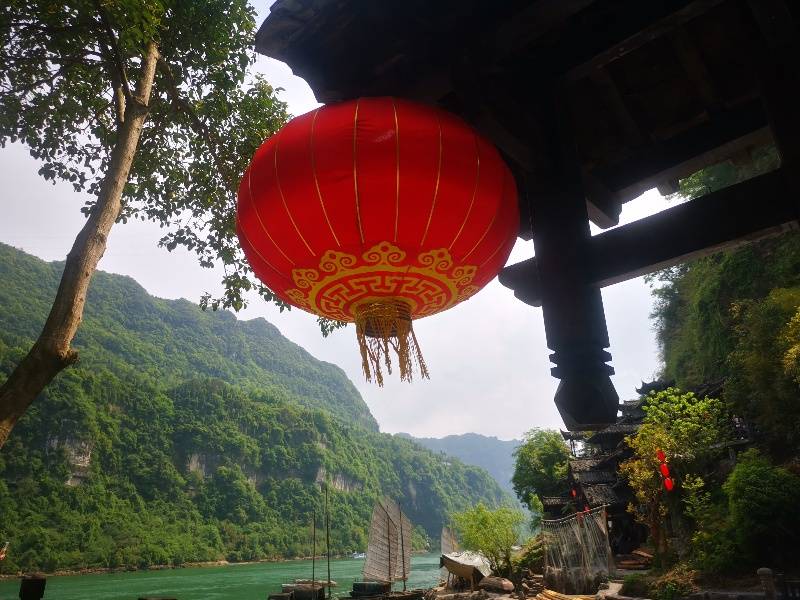 10:30换乘景区中转车到胡金滩码头,渡船过江后游览三峡人家(石令牌、巴王宫、茶盐古道非遗传承一条街,巴王赛,三棵树广场观看演出)