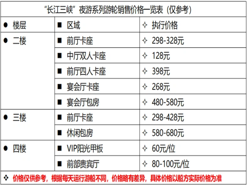 长江三峡系列游船上个人消费,下图为参考价格,具体以船方报价为准。