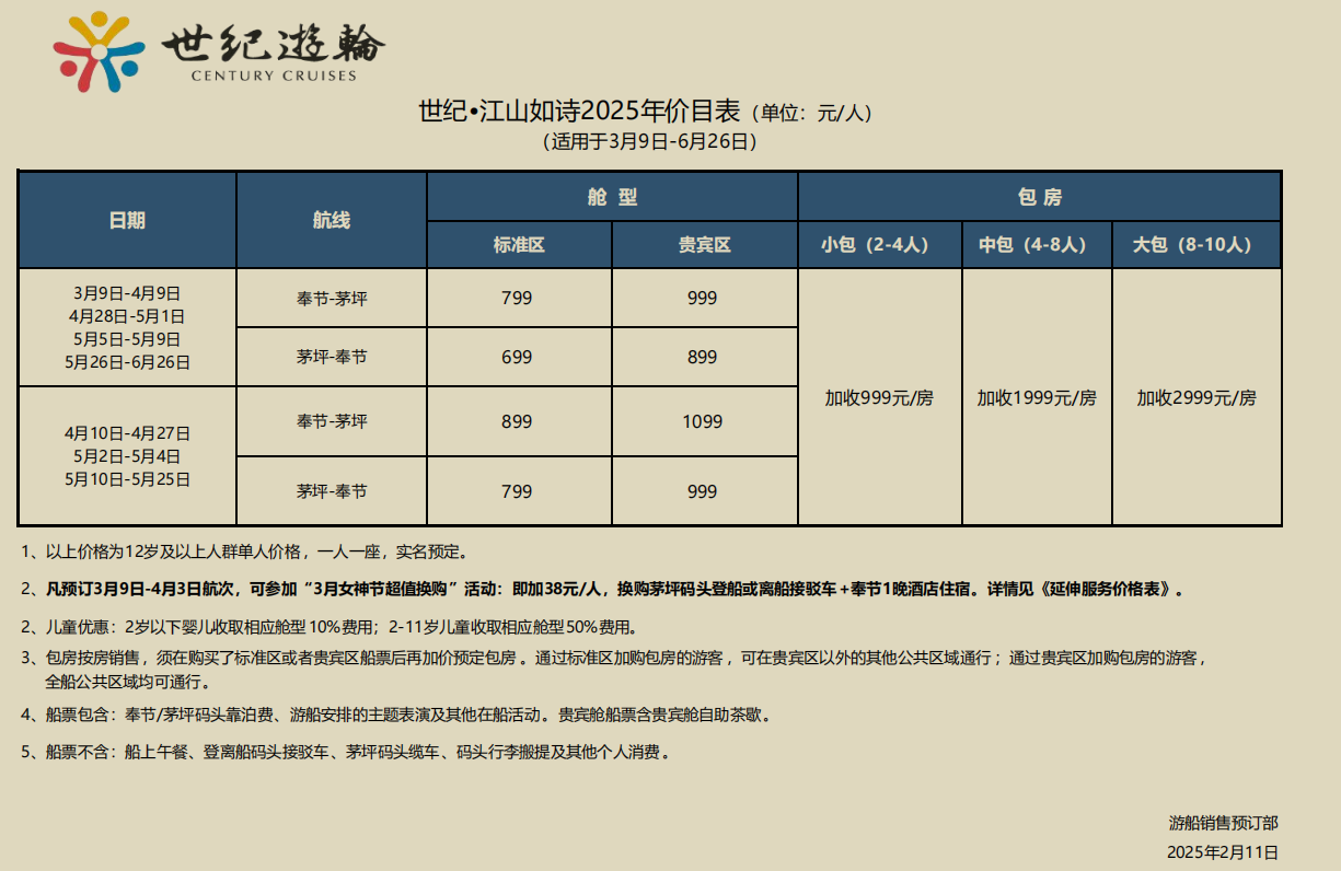 千里江陵一日还,在这里,我们不需要匆忙下船,也不必去到岸上游览景点,在如今时间这么宝贵的情况下,只需要花费一天的时间,就可以在游船上,看到瞿塘峡、巫峡和西陵峡的优美风光,行程时间短,我们可以更自由的选择出发时间,班次密集,工作日和周末都可以出发,首艘主题豪华观光游轮,5层甲板,餐厅、包房、游戏区一应俱全,那么该如何预订世纪江山如诗游船呢?世纪江山如诗2025上半年的具体价格和航期是什么样的呢?跟着小编一起在往下看吧!