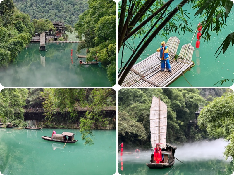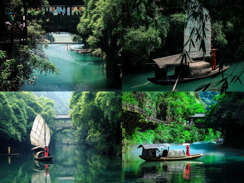 下船后去往龙进溪,避开主路人流,这里的乌篷船的五一限定布置,搭配翠绿溪水和岸边盛放的春日绿植,身着土家服饰的幺妹撑篙而立,随手一拍就是国风大片。建议选择上午9-11点拍摄,此时光线柔和,游客较少,阳光透过树叶洒在水面,波光粼粼,拍出来的照片清透又出片,还能避开人流杂乱背景。