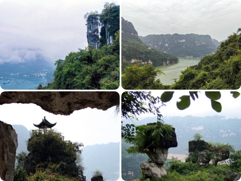 乘坐登山扶梯上山,避开山间人流,抵达观景台可俯瞰长江与溪谷全景,远处石令牌巍峨矗立,脚下长江蜿蜒,两岸青山连绵,五一期间山间云雾缭绕,拍全景照大气磅礴,自带“山河辽阔”的震撼感。