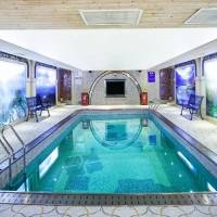 装潢风格独特:内部设计以简欧风格为主,大厅的罗马柱大气稳重,穹顶以及墙面采用金色系的环保材料,彰显轻奢典雅的空间氛围,同时采用各种水晶装饰来体现 “水” 元素的低碳环保理念。