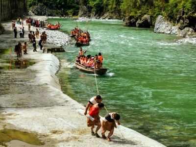 三峡蓄水前的神农溪,滩多水急,峡谷幽深,绝壁夹峙,历有“一里三湾,湾湾见滩”之说,三峡工程蓄水后的国际旅游景点神农溪,游客乘坐环保游船,可欣赏到比水位上涨前更多的风光,可体会到峡谷的幽深。神农溪两岸山峰依然高耸,古老朴实的纤夫拉纤及乘坐原始的豌豆角扁舟漂流依然存留。坐在小木船上,欣赏纤夫拉纤,仿佛回到遥远的古代,高亢的号子声,贴着岩壁,贴着溪水,贴着沙石滩,空谷回荡。今天的神农溪碧波荡漾,风景如画,是新三峡旅游线上的一颗璀璨明珠,是中外游人的旅游胜地。