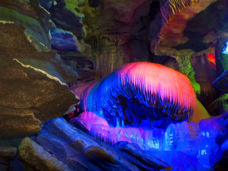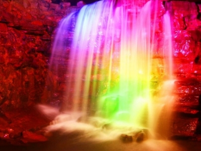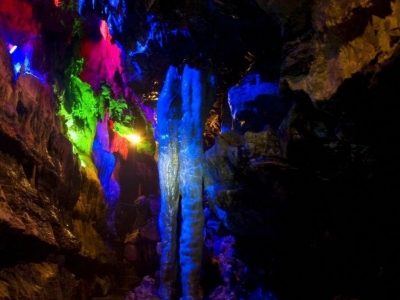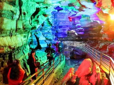 据位于晓峰风景区内与悬棺一河相隔的对面,是一个地下溶洞。情人泉是1997年被发现,1998年4月28日对外开放的景区。经地质学家考证,它是一条由裂隙水系发育而成的地下河,可考察长度约十公里,集洞、泉、瀑于一体。情人泉有着非常罕见的寒武系、地质年龄约七亿年的白云岩溶 情人泉夜景 洞。它的地下河风光和地下瀑布,在全国都是十分罕见的。情人泉第一期工程已经开发游程700米,在这段游程里,游人已经能够领略到天趣盎然的情人渡、情人谷、情人河、情人宫等四大系列自然景观。上了情人渡的船,情人泉的生动就向人逼来。情人瀑的轰鸣也隐隐地传了过来。它似乎一开始就想做为情人泉的音乐背景,弥漫进每一位游者的心灵。情人泉的点睛之笔就矗在了眼前。两个体态婀娜的钟乳石,连体成双,犹如情侣相拥,玉体相偎,其状难舍难分,在这里一站就是一千年,一万年,上亿年。做为万物之灵的人类,说过的所有山盟海誓,在他们这种站立历史面前,显得那么虚弱和苍白。